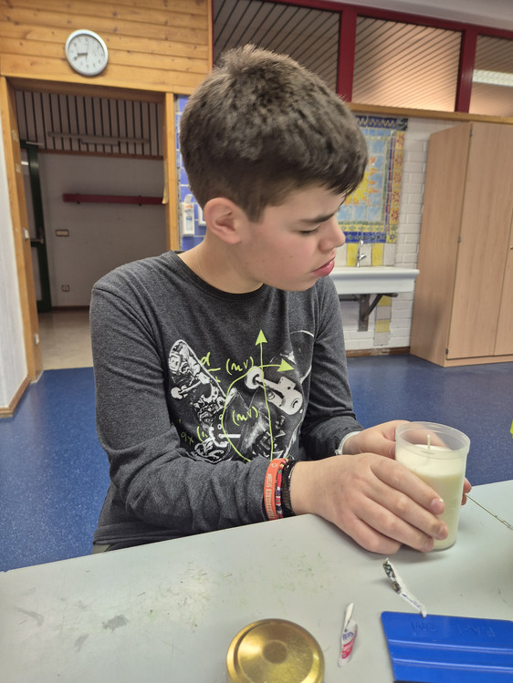 Die Etiketten mussten an allen Grablichtern entfernt werden. Dabei haben wir alle fleißig geholfen. Anschließend wurden verschiedene Schriftzüge auf den Grablichtern festgeklebt.