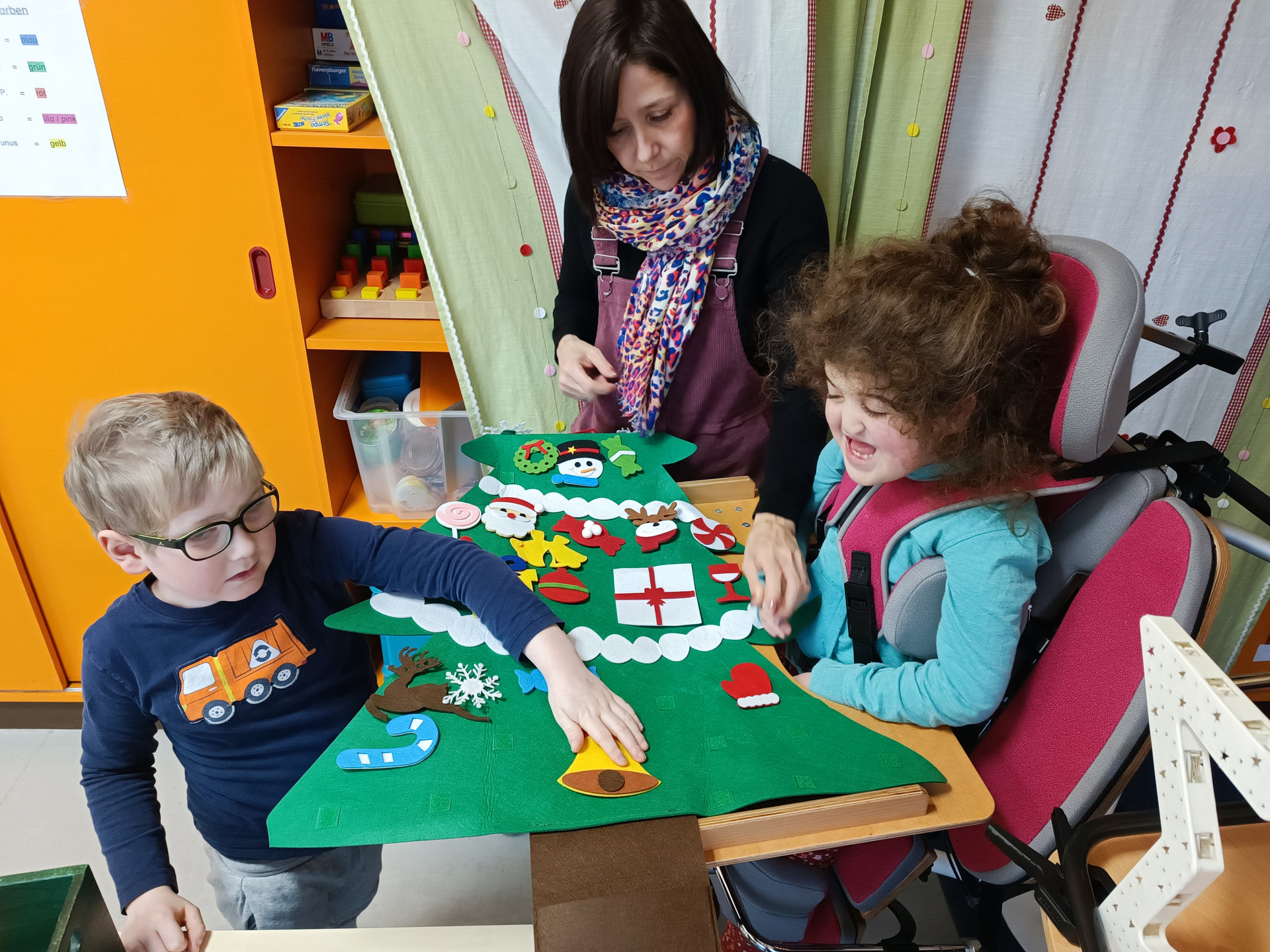 Auf dem Bild ist der erste Preis abgebildet: ein Weihnachtsbaum aus Filz, der von der Gewinner-Klasse liebevoll gestaltet wurde. Auch die anderen Teilnehmerinnen und Teilnehmer sollten nicht leer ausgehen. Ihre Mühe wurde mit einem Schokoladennikolaus belohnt.