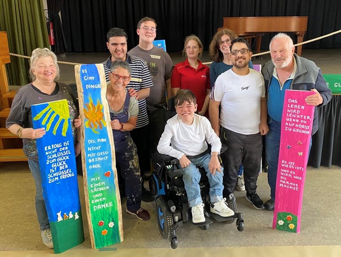 Sie halten zwei Zukunftsbretter (links und rechts) sowie das „Dankebrett“ (zweites Brett von links).